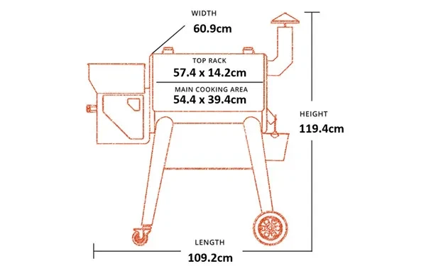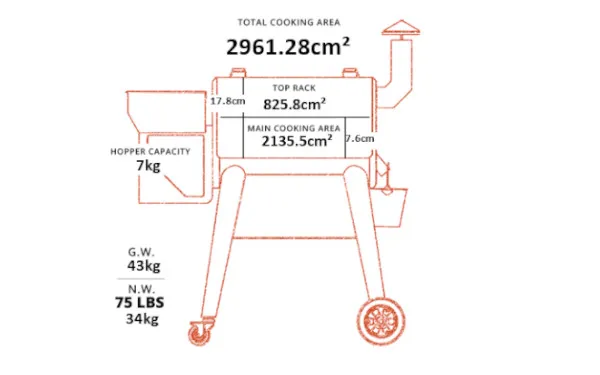 - Automatic Pellet Refill:Â Simply fill the hopper with your favourite hardwood pellets, and it will automatically feed them into the fire pot at an adjustable rate – no need to manually check every few hours! This wood fire is the main source of heat and smoke which evenly circulates around the cooking chamber just like a convection oven.